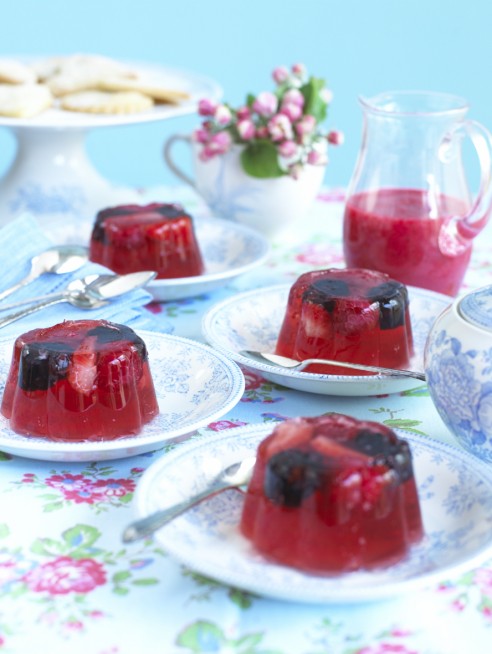 Divide the berries between 6 individual jelly moulds (or 4 x 175 ml individual pudding basins) then pour over the juice until the berries are just covered. It’s a good idea to rinse the moulds first and leave a little water clinging to the sides- this can help stop the jelly from sticking. Leave in the fridge for about 1 hour or until almost set. Pour over the remaining juice to fill the moulds or pudding basins and return to the fridge to set completely. Alternatively you could set the jelly in one large 750ml jelly mould.