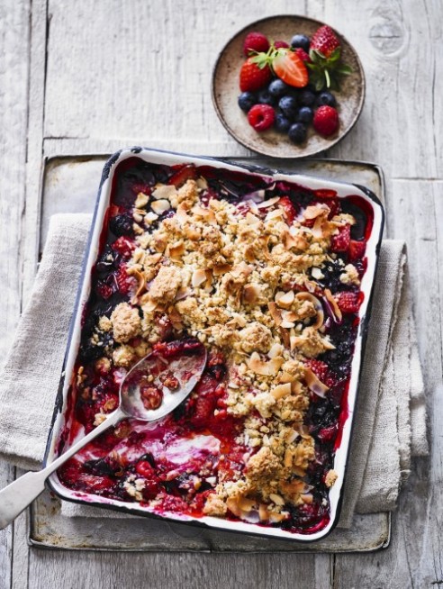 Mixed berry bake with coconut macadamia crumble