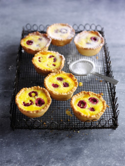 6. Strain the custard through a sieve into a jug. Pour into the baked tart cases then add 3 raspberries to each. Bake for 15-20 minutes until the custard is just set then leave to cool in the tins. To serve, loosen the tarts with a knife then remove from the tin, serve as they are or lightly dusted with sifted icing sugar.