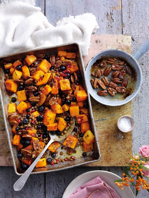 When the pumpkin is cooked through, throw in the blueberries, lentils, a pinch of salt and the olive oil to the roasting tray and stir well. Place the tray back in the oven for 5 minutes to roast a little longer then remove and serve with the pomegranates and pecans sprinkled over the top.