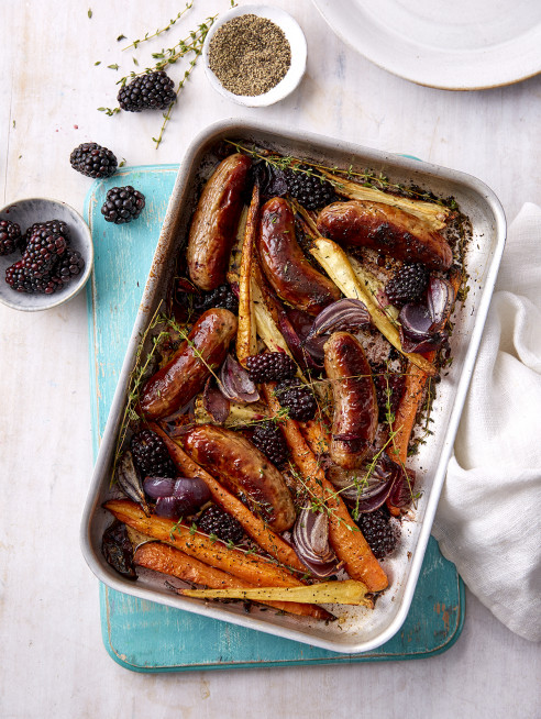 Start by roasting the sausages for about 10 minutes before adding the onions, parsnip, carrots and blackberries. Add a generous glug of olive oil and season with salt, pepper and thyme.