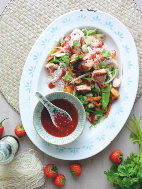5. Add the remaining strawberry sauce to a small bowl, set this on a large platter, stir half the coriander into the noodles then spoon on to the platter. Break the salmon into large flakes, scatter over the noodles with the remaining coriander. Serve with lime wedges, if liked.